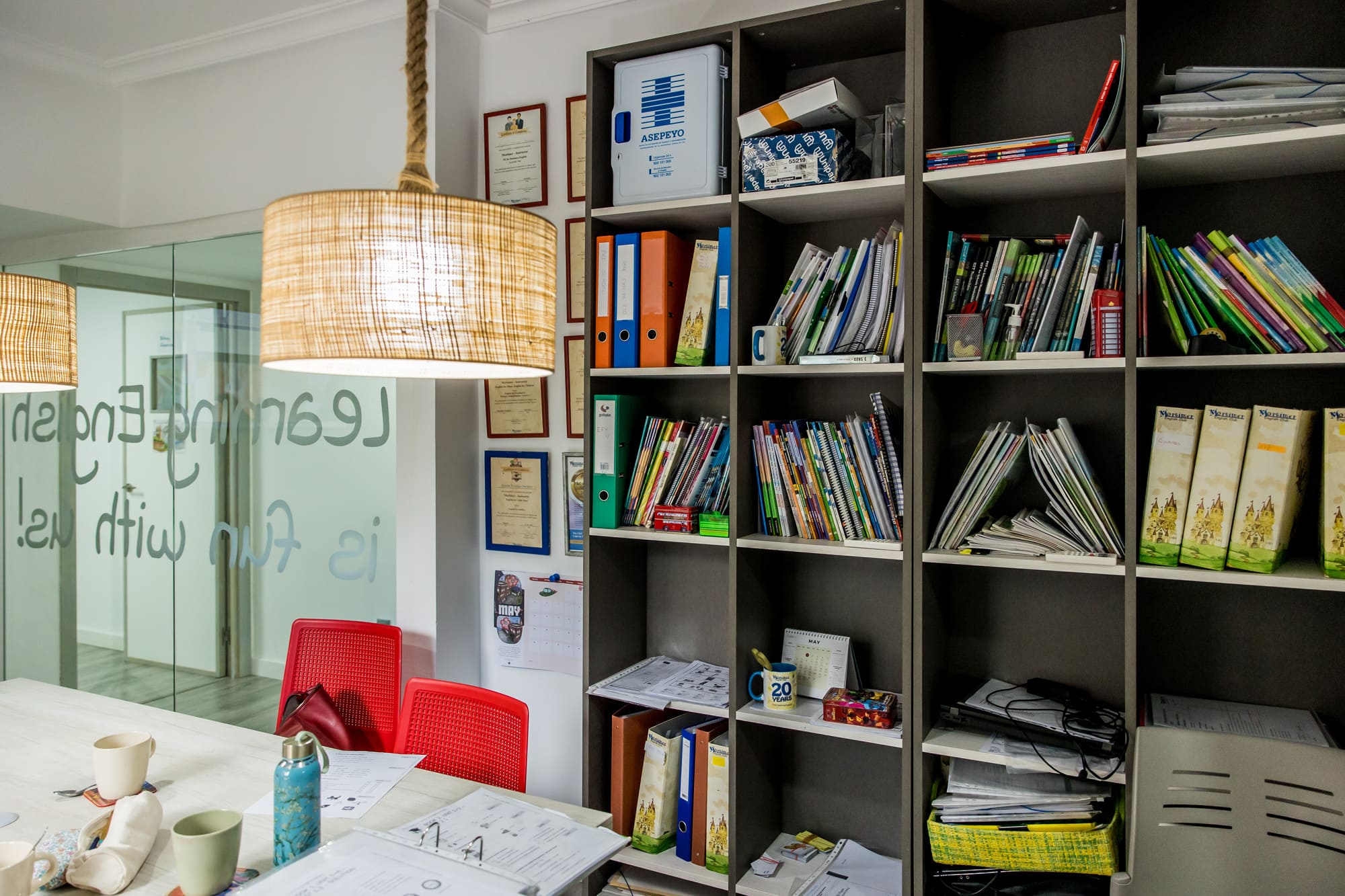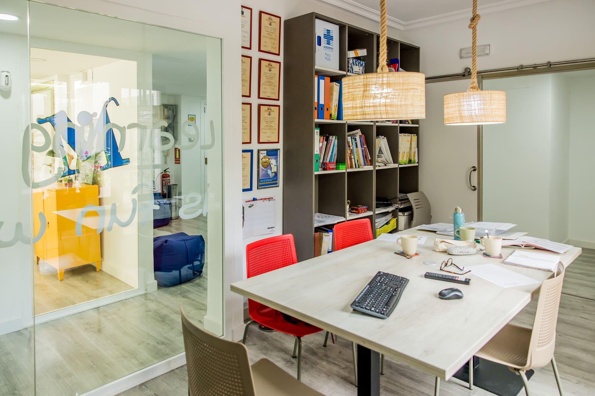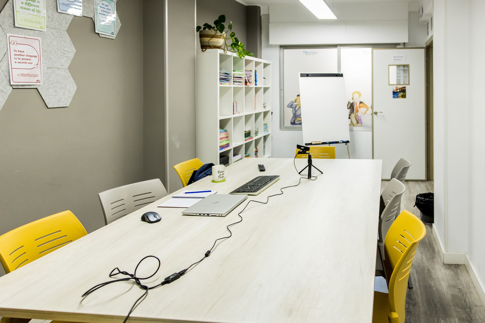 Finalmente, nuestro salón multiusos es un espacio versátil al servicio de todos. Aquí realizamos reuniones de padres, exámenes oficiales y simulacros de los mismos, y también es un lugar perfecto para disfrutar de un café o grabar vídeos. Este espacio está diseñado para adaptarse a las diversas necesidades de nuestros teachers y estudiantes, ofreciendo siempre un entorno cómodo y funcional.